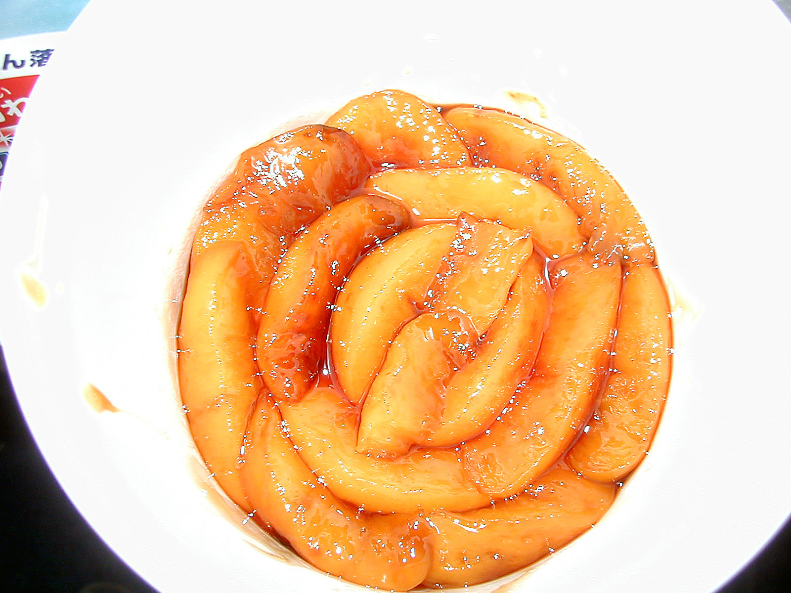 3、1、2の間に黄桃の缶詰をあけ、水気を切り、八つ切りにする。